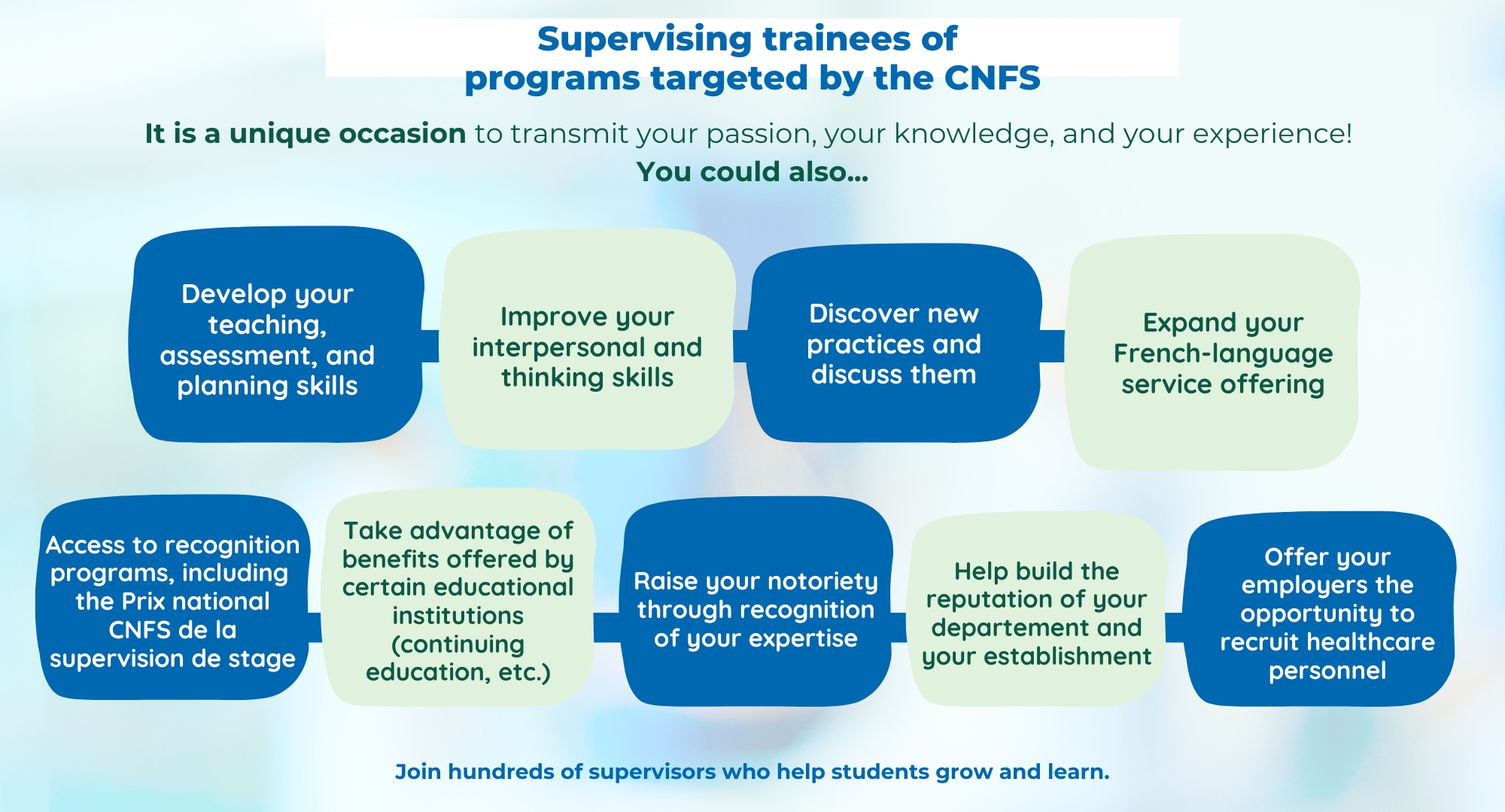 Contribute to training the next generation by becoming a supervisor. By mentoring trainees from programs targeted by the CNFS, you will enjoy many benefits.