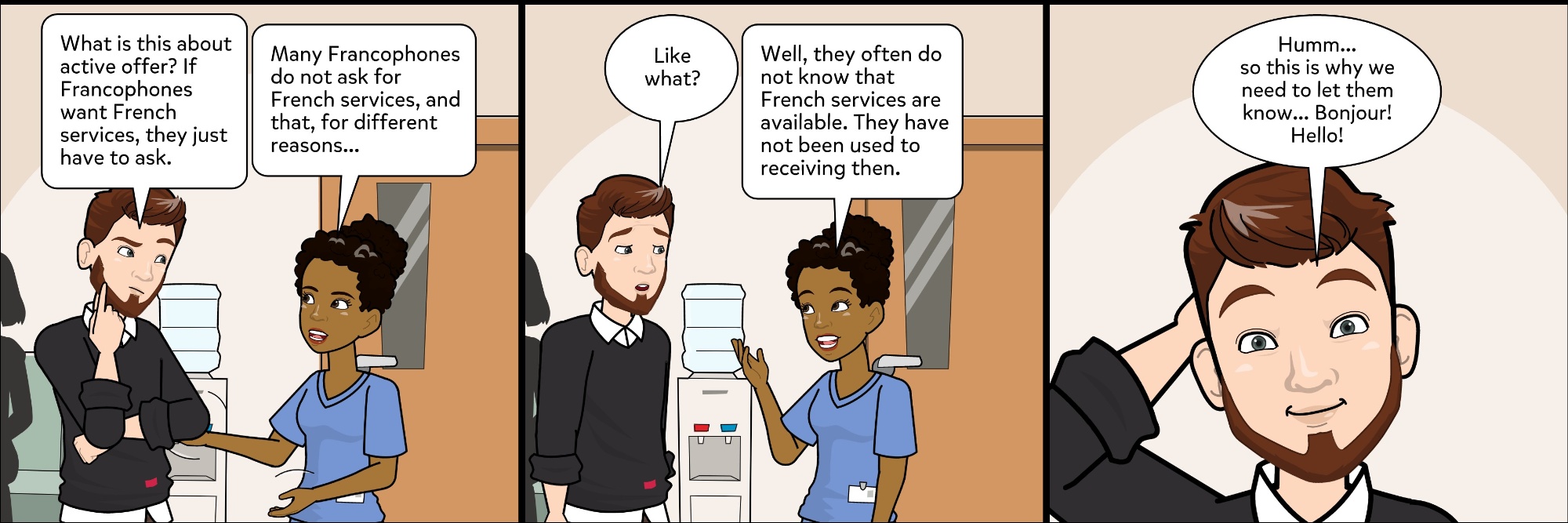 Active offer consists of offering health services in both official languages from the very first meeting. For members of Francophone minority communities, the active offer is a first step towards accessing health services in French.
